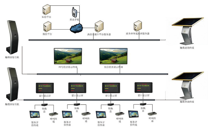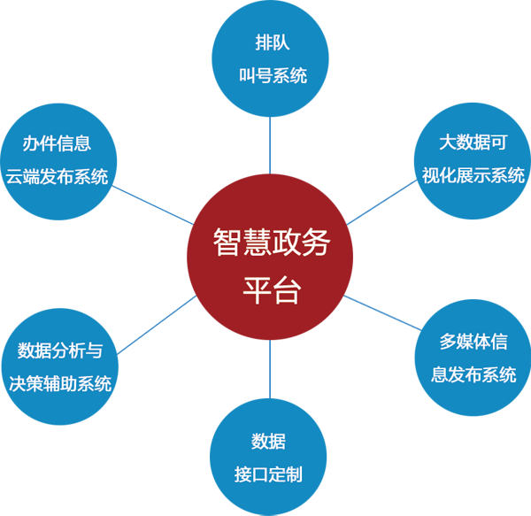 慧能科技依據自身豐富的政務服務行業經驗和研發創新能力,貼合群眾需求,整合資源研發了“智慧政務平臺”。該平臺集成了排隊叫號、服務評價、信息交互與發布、移動互聯網應用、大數據可視化展示、大數據分析與決策輔助等功能模塊。平臺軟件采用B/S 架構設計,方便安裝、使用與維護。通過與互聯網、移動互聯網技術的結合、與“政務業務系統”、“電子政務平臺系統”、“OA系統”等業務系統的數據對接,可以為辦事的人民群眾提供準確、及時、有效的信息,改善辦事秩序,方便人民群眾辦事,提高人民群眾對政府辦事機構的滿意度。